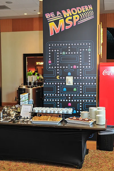 These are graphic files of the designs I created for the conference hall space. For the actual event we went with a "Back to the Future" theme, even going so far as to rent a Delorean car. The idea was that, "You've been using old tools to solve new problems. It's time to get back to the future with MSPComplete". We wanted it to be fun and nostalgic, playing off old games like Snake, Pac Man, and Tetris. Many of the partners who attended were in the technology field in the 80's so we were hoping to hit a chord with them. Overall, we wanted the conference look and feel to be fun in the common areas, whereas in the session rooms we remained minimalist to avoid distraction from the actual material being presented by the speakers.
