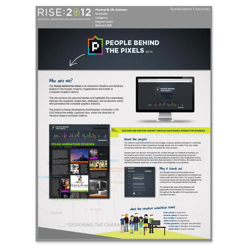 People Behind the Pixels was my senior capstone project at Northeastern University. In the Arts, Media and Design program, all the seniors double majoring in Interactive Media took a year long class together and spent that time developing a polished project together. Because of the diverse backgrounds of our “other” major (ranging from graphic design, to music, to computer science) we created a pretty realistic imitation of a start-up company.